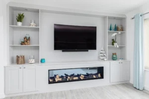 When planning your media wall with electric fireplace, airflow is a critical technical detail. Even though electric fires do not produce real smoke, they often have front or top-vented heaters. A built-in media wall must be designed so that these vents are not obstructed.